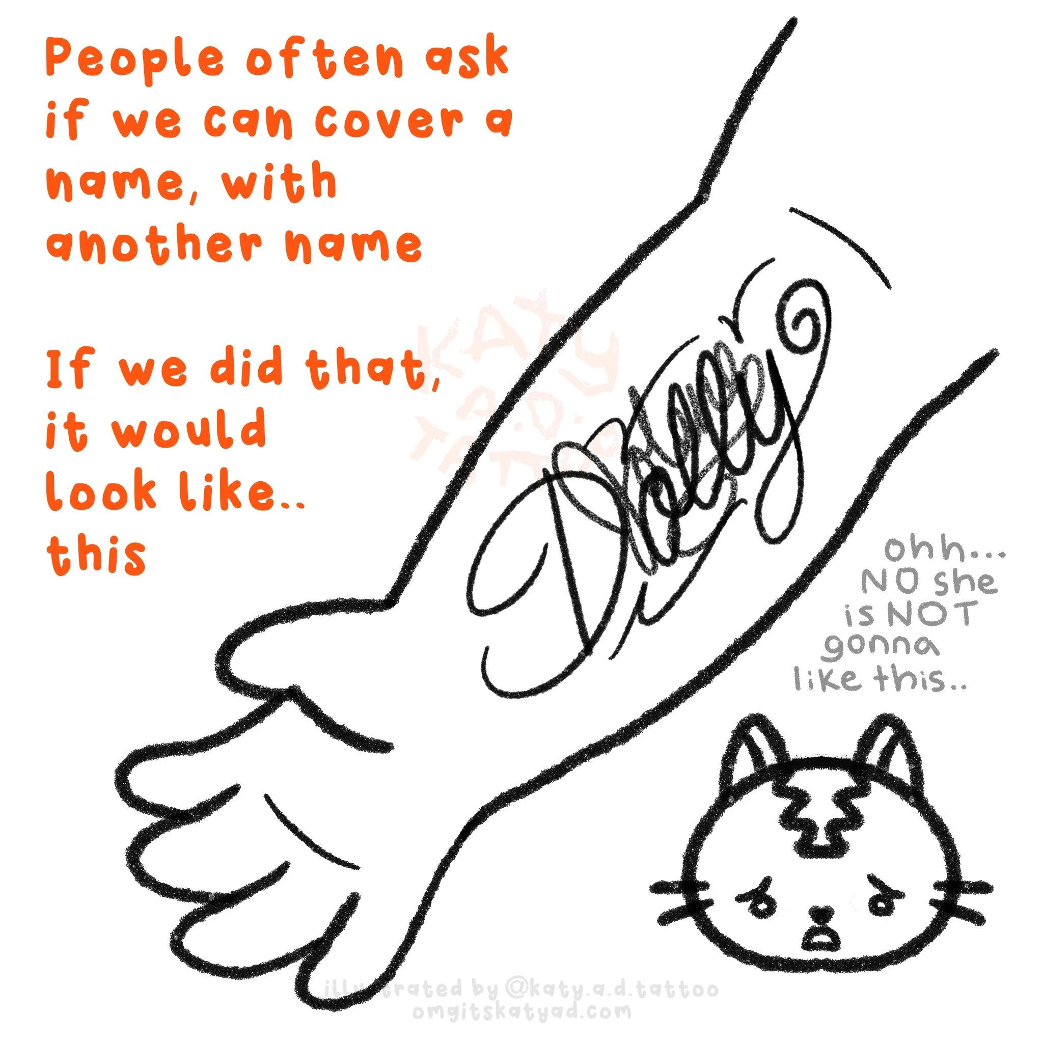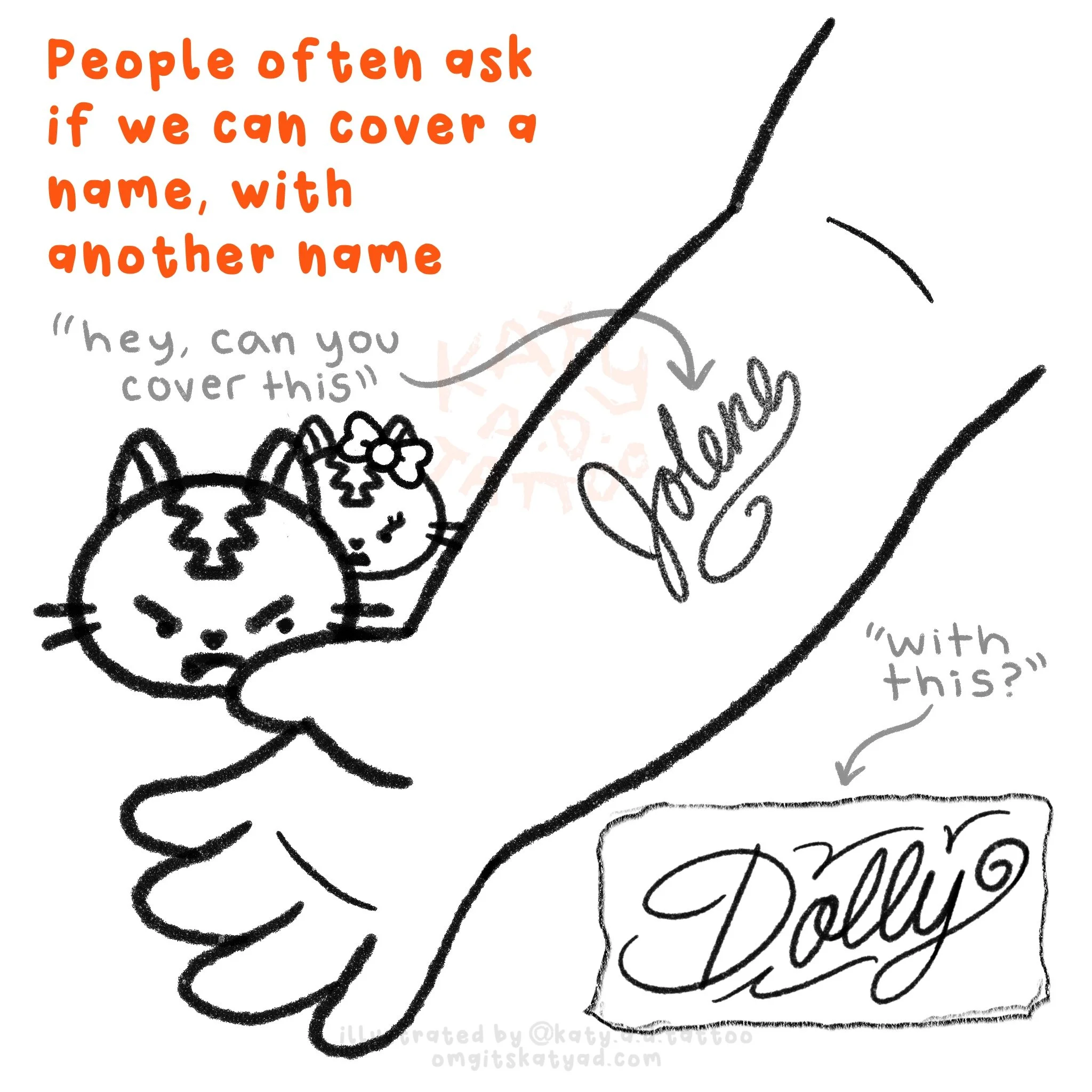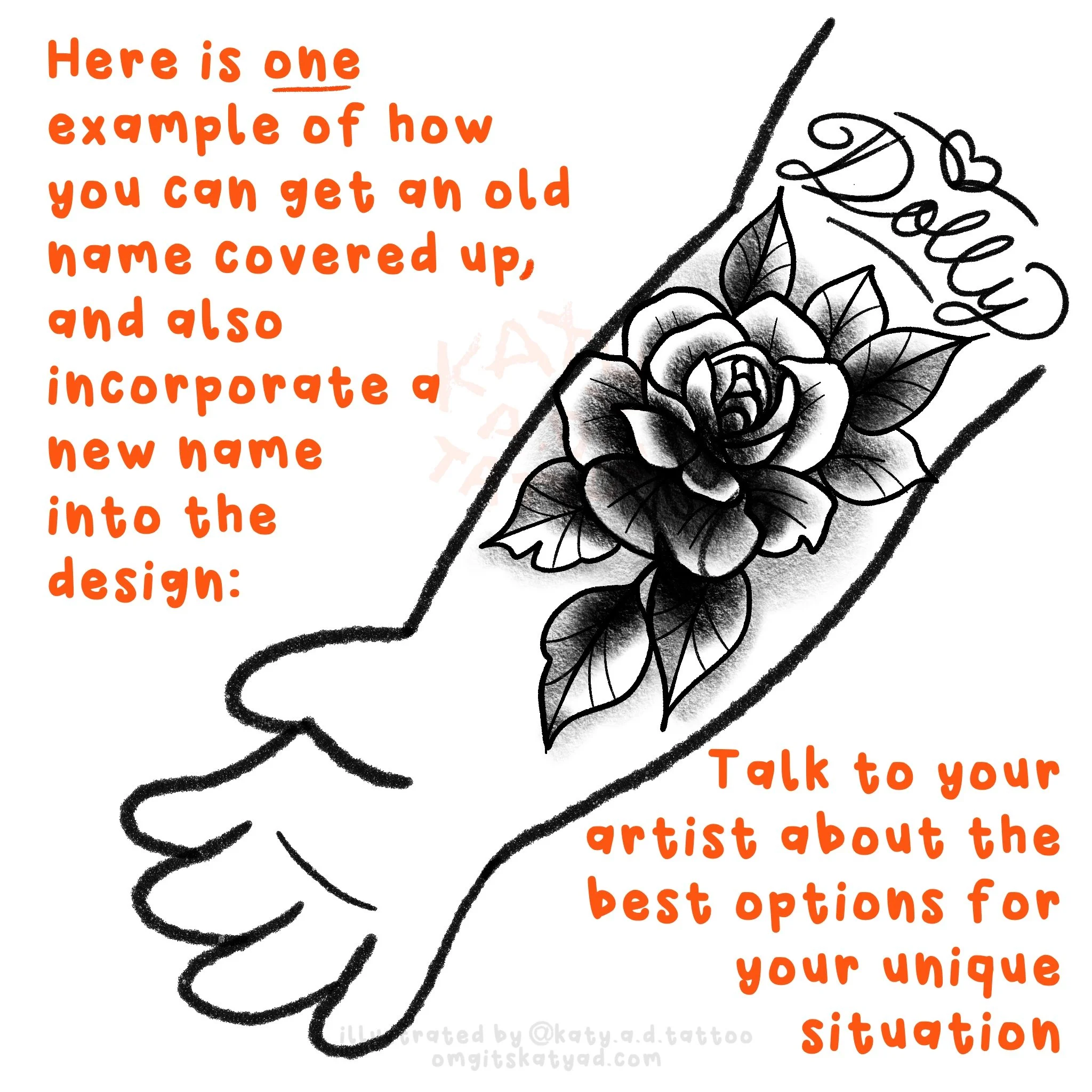 The old name (“Jolene”) is covered effectively by the rose, and the new name (“Dolly”) was added elsewhere in the design. This format may not work for all coverups, but did work well in this example.